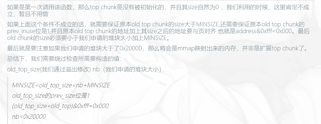 - 修改top chunk的size,然后add一个大于top chunk size的chunk让top chunk进入unsorted bin,注意top chunk的inuse要为1,同时注意页对齐