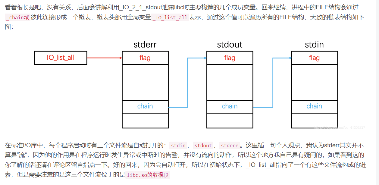 - FSOP 是 File Stream Oriented Programming 的缩写,根据前面对 FILE 的介绍得知进程内所有的_IO_FILE 结构会使用_chain 域相互连接形成一个链表,这个链表的头部由_IO_list_all 维护。