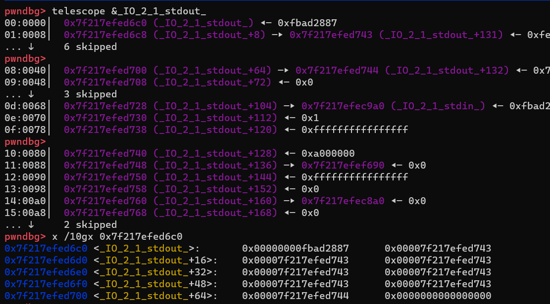 具体细节见博客 经过一系列调用最后进行系统调用 _IO_puts -> _IO_new_file_xsputn -> _IO_OVERFLOW -> _IO_do_write -> new_do_write -> _IO_SYSWRITE