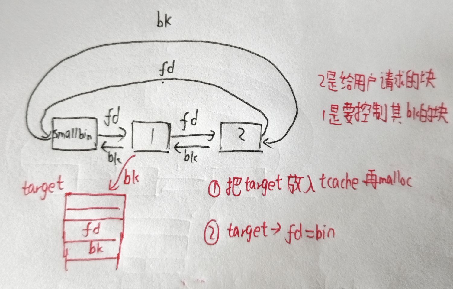 - 如果我们可以控制smallbin的bk,那么bck就可以为任意地址,而后它又被放到tcache中,我们可以将它再malloc出来利用