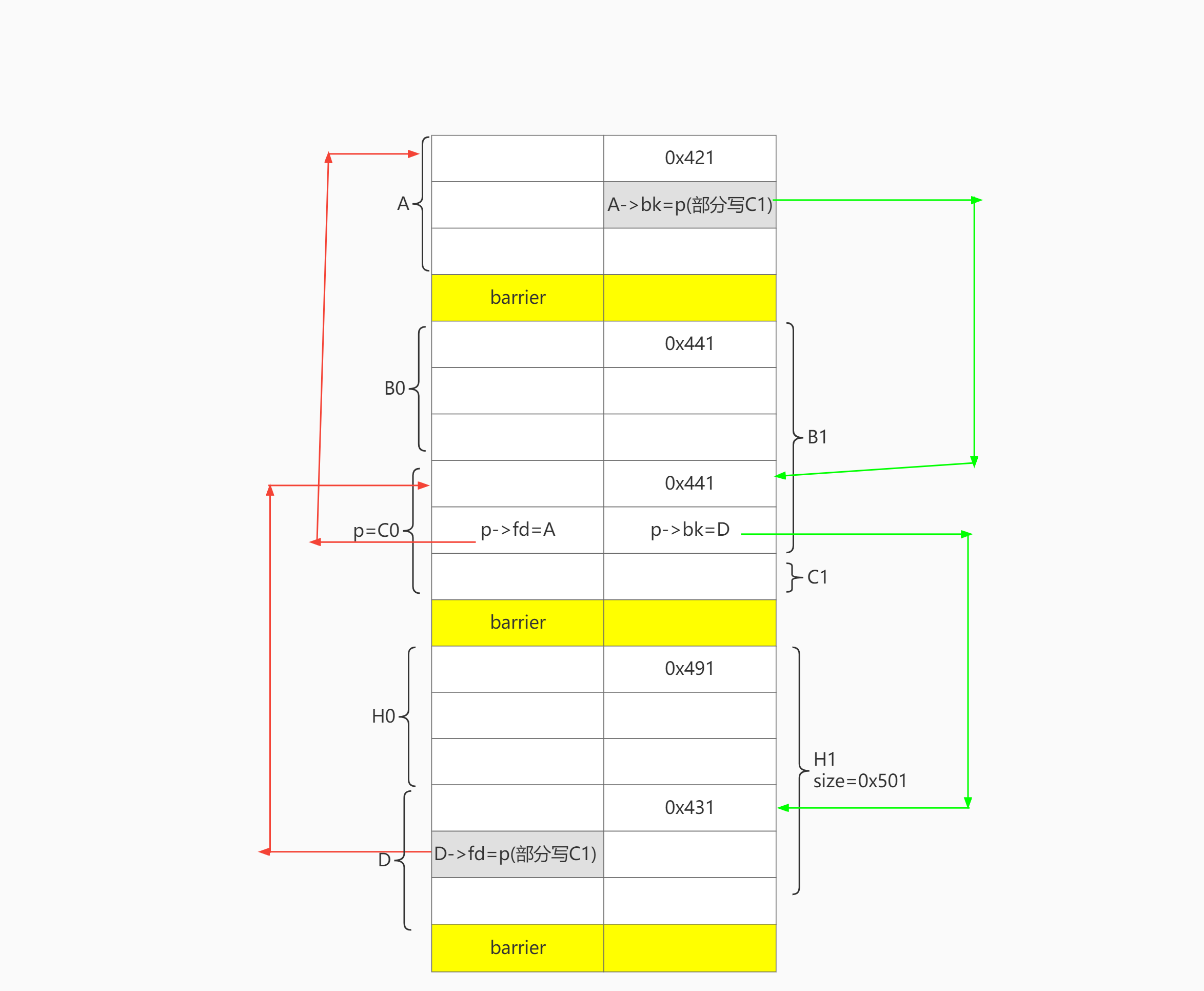 # unsortedbin: C1-A , A->BK = C1
