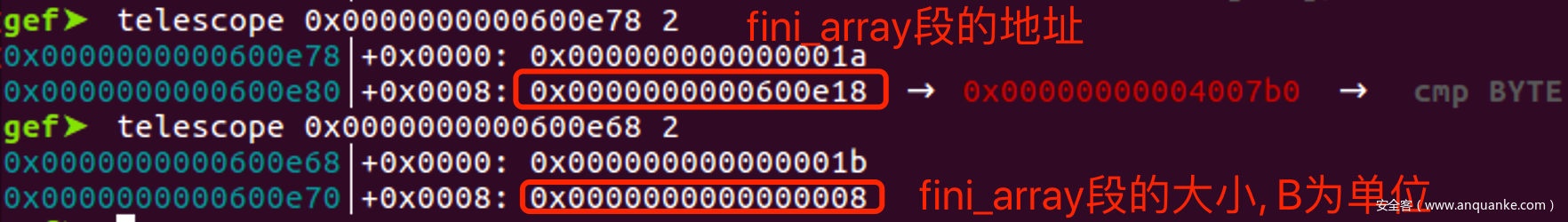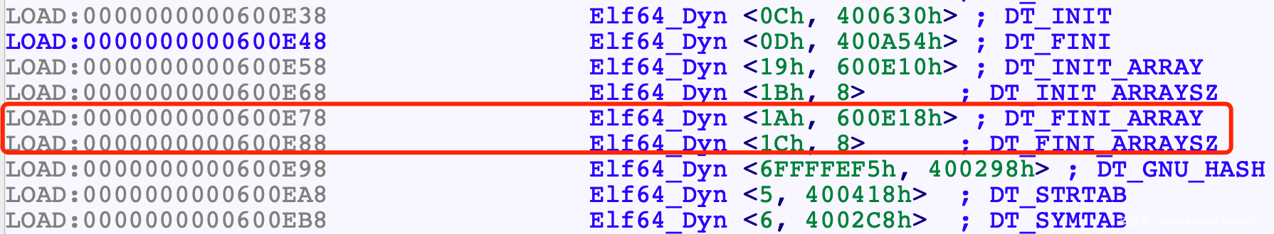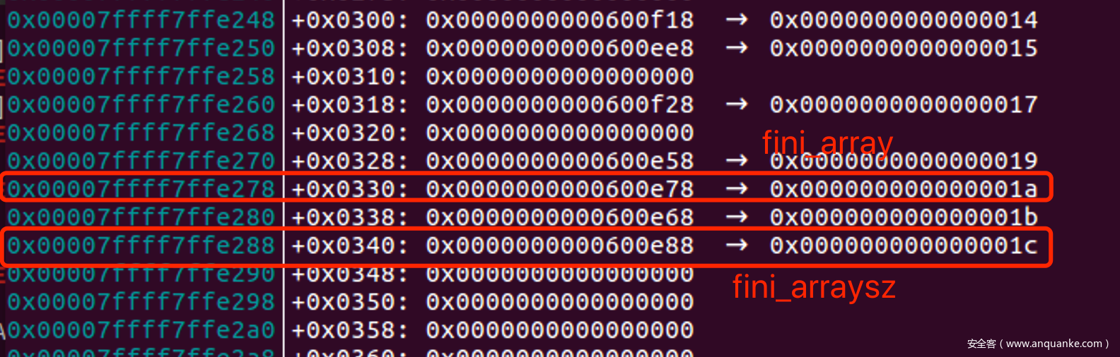 l_info中关于fini_array节的描述符下标为26, 关于fini_arraysz节的下标是28, 我们动态调试一下, 看一下具体内容