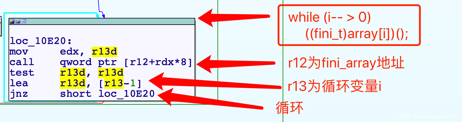 我们首先需要从汇编层面考察下fini_array中的函数是怎么被遍历并调用的, 因为这涉及到参数传递问题