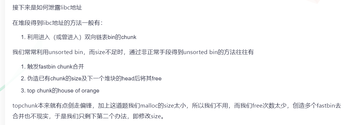- 有时候会没有uaf,这样进入unsorted bin也不是很好泄露。但是可以利用chunk进入unsorted bin或者largebin会向其fd或者bk写入libc地址的特性,再add出来进行泄露就可以了