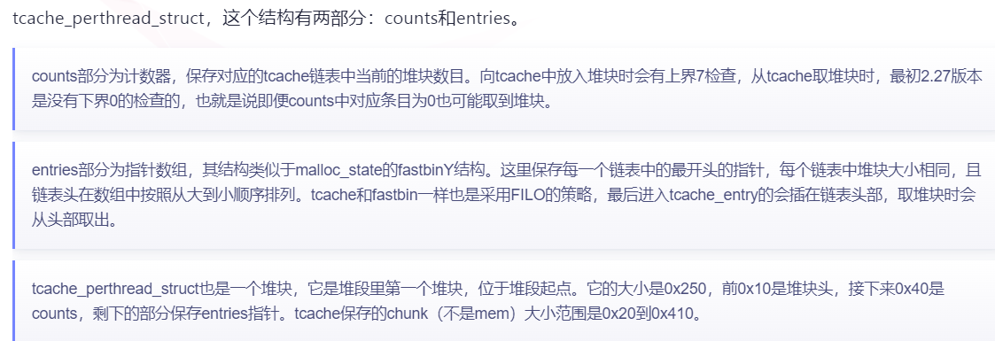 - 有时候可以add的次数有限或者可以申请的chunk数量有限,所以不能直接用一个循环填满tcache,这时候可以通过修改tcache_perthread_struct中的counts数组,也可以达到填满tcache的效果