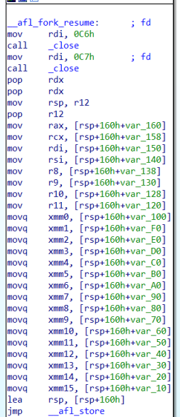 - __afl_fork_resume,可以看到ida反汇编后的内容比较奇怪,这是因为这里是在恢复所有寄存器,恢复栈地址
