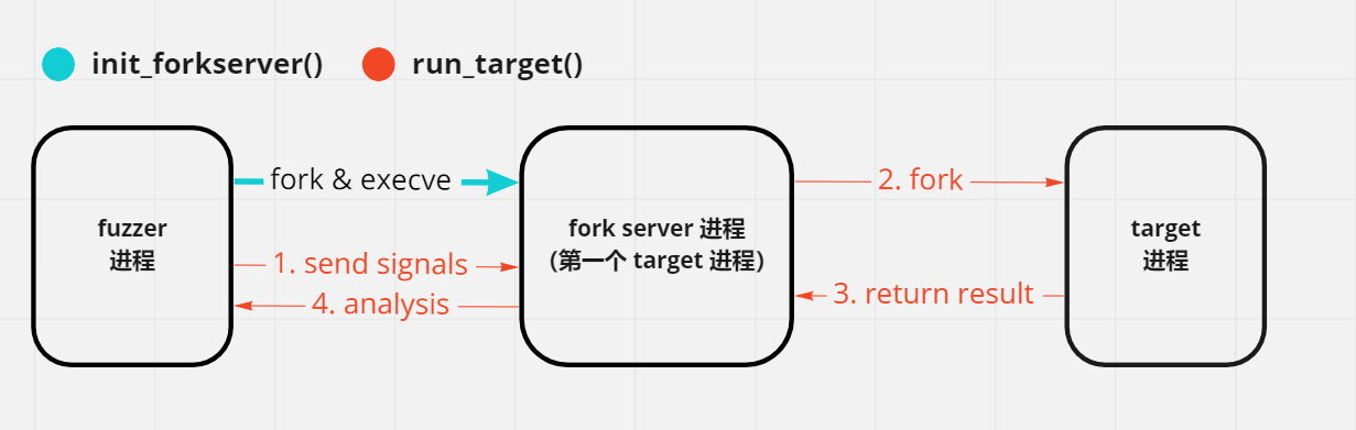- execve() 的效率比较低。fuzzer 需要高频率地执行目标程序,显然不宜在 execve() 上浪费过多时间。AFL 的解决方案是使用 fork server:让程序在第一个基本块处停下,等待 fuzzer 发送指令;收到指令后继续执行程序;执行完毕后,恢复 fork 时的状态。得益于 copy-on-write 技术,我们可以高效地实现这一需求。