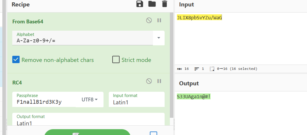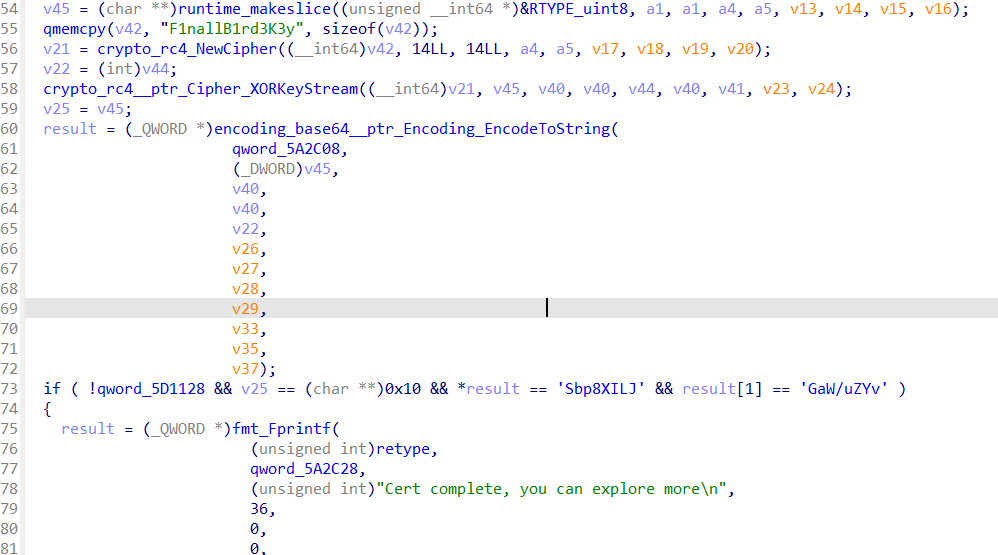 所以第一步我们要先过了cert,可以看func1中看到就是一个RC4加密然后进行base64,与JLIX8pbSvYZu/WaG字符串进行比较看看是否相同,RC4密钥也给了,所以可以想到就是直接cert S33UAga1n@#! 但是会报错Missing parameter
