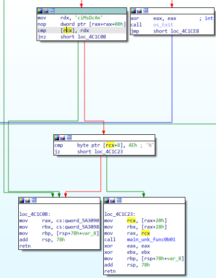 继续看func5中的cert流程,很明显地可以看到有个mov rdx, …;cmp [rcx], rdx这种指令,自然可以想到这就是字符串比较,而在逆向中这些字符串可以说是关键节点,一定要留意。