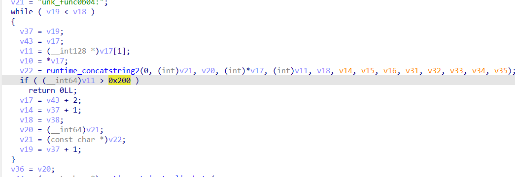 在go中,经常会看到这样的结构,buf[i]存的是一个指针,这个指针指向一个字符串,buf[i+1]存的是这个字符串的长度,可以看到v71 = *(_QWORD *)(v28 + 8);也是这种结构