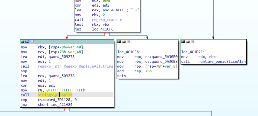 所以我们可以大胆猜测,这个strings_genSplit过后,返回的是一个结构体数组,每个结构体元素是有(void *)ptr,int64 len这种结构,这里就是通过’.‘这个字符进行分割,我进行了验证发现确实如此