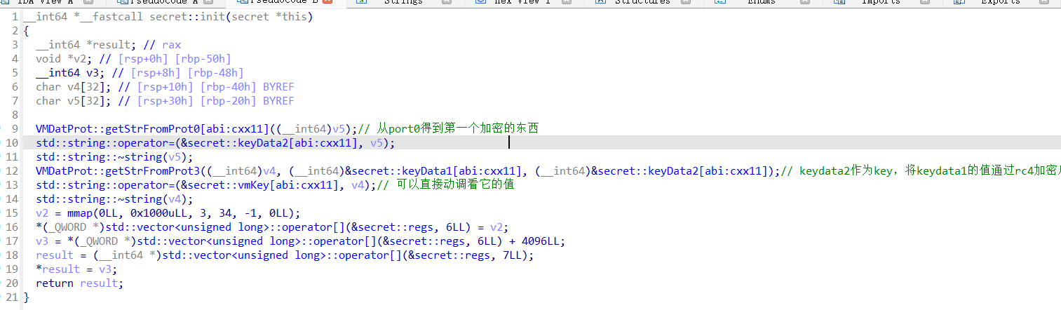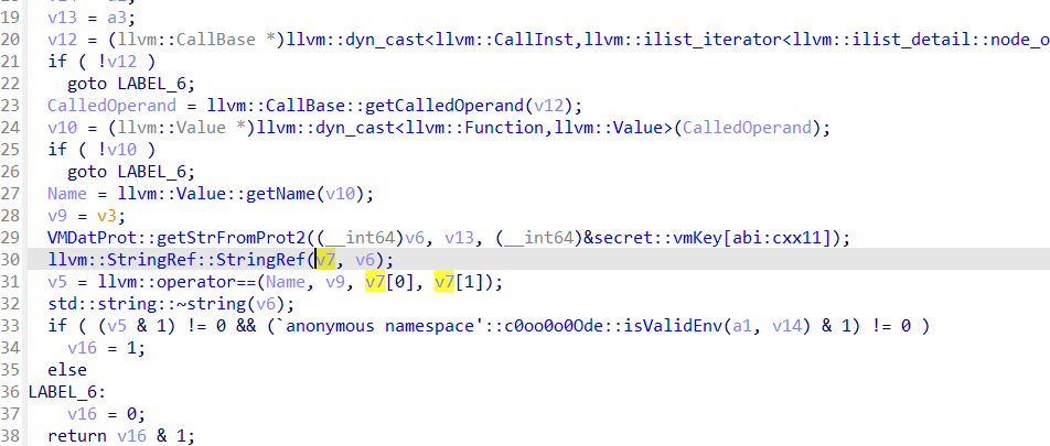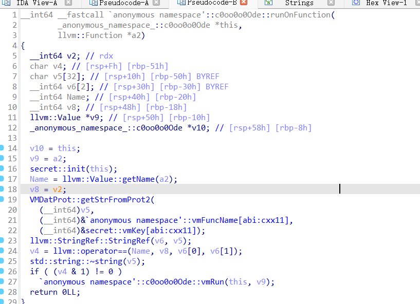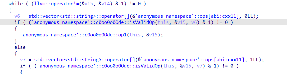 首先根据anonymous namespace::ops[abi:cxx11]取出对应的值,然后用vmkey来进行解密,判断函数名是否和给定的一致