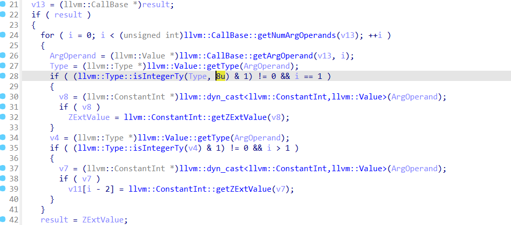 这里的llvm::Type::isIntegerTy(Type, 8u)这里的8是指8位,也就是char型,我一开始以为是8个字节,查阅资料后才知道错了。而且从上面的变量定义也可以看到是unsigned char类型
