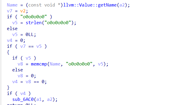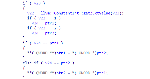 - v31 = (llvm::ConstantInt *)llvm::dyn_cast llvm::ConstantInt,llvm::Value (ArgOperand);ZExtValue = llvm::ConstantInt::getZExtValue(v31); 把参数变成Int类型,然后进行0扩展