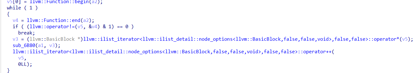 - llvm::Function::begin和llvm::Function::end都是Function类的迭代器对象,其迭代的对象是函数中的基本块。因此这个循环的意思就是对每一个基本块执行sub_6B80函数。