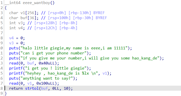 - 题目分析:checksec发现开启了pie,这意味着如果没有泄露pie所有gadget都不能用,printf(“heyhey , hao_kang_de is %lx \n”, v1);只能打印栈地址,起初想看能不能控制来泄露pie或者libcbase,发现都不行,思路就卡住了(做题时也被这个泄露给迷惑了,一直往泄露方面想)