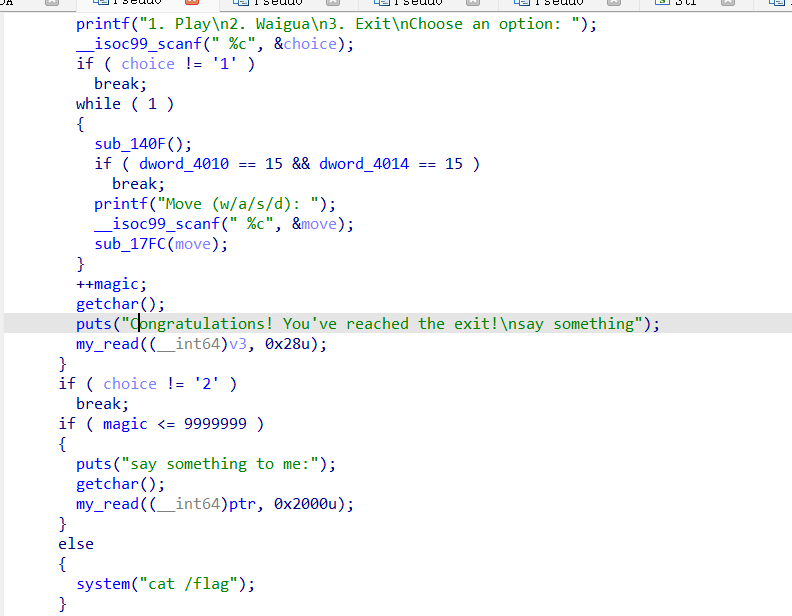 - 可以看到要么满足magic的条件,这个次数很难实现。迷宫具体代码没有去逆向,但是发现每次基本一致,所以只要随便让P到达终点即可