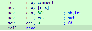 - 有时候ida反汇编会是read(0, comment, 0x8CuLL);这样的,但是仔细看汇编代码是这样的,需要引起注意