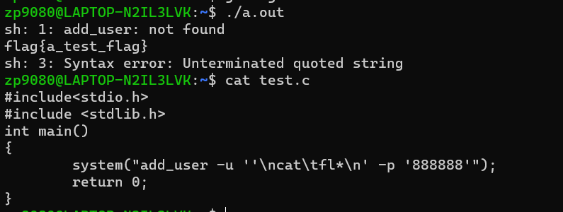 在这个里面-u的参数为’’,也就是为空;第二个命令是cat\tfl*;最后一个命令单引号没有闭合我们也不用管了(这里报了格式错误),因为我们只要执行cat\tfl*就可以了。这就是利用单引号的绕过