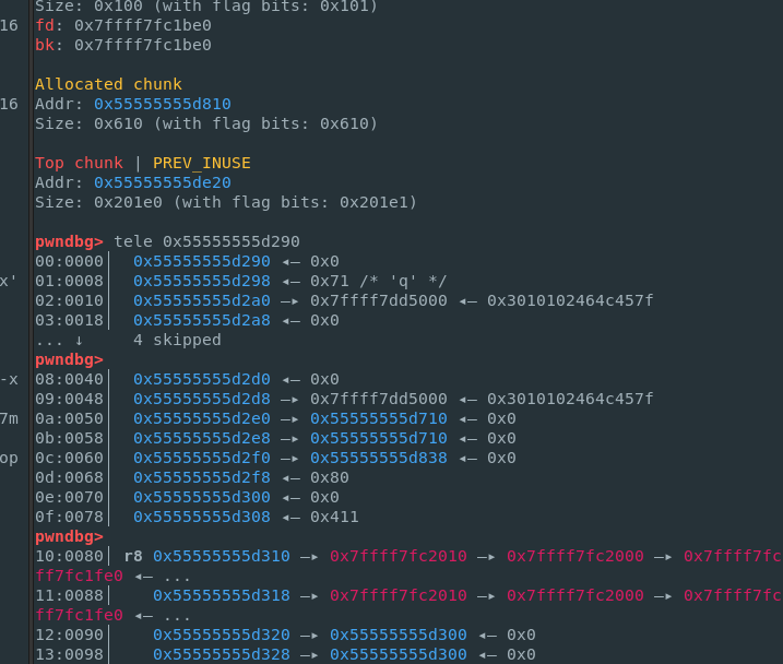 既然有free和malloc,而且一开始的栈对应的堆块是0x510大小,free后直接进入unsorted bin,那么再malloc直接可以申请出被写入了libc的地址,同时利用swapreg0的越界,就可以leak出libc