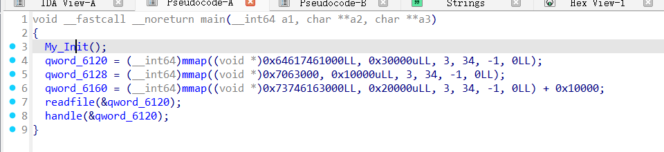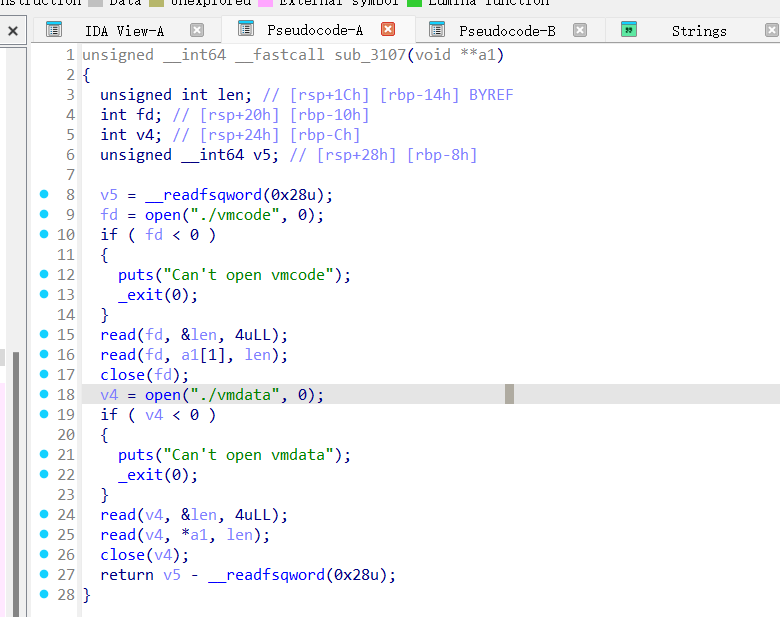 main函数,附件中还有vmdata,vmcode这两个文件,这两个文件是用来初始化vm要执行的代码以及要打印的字符串