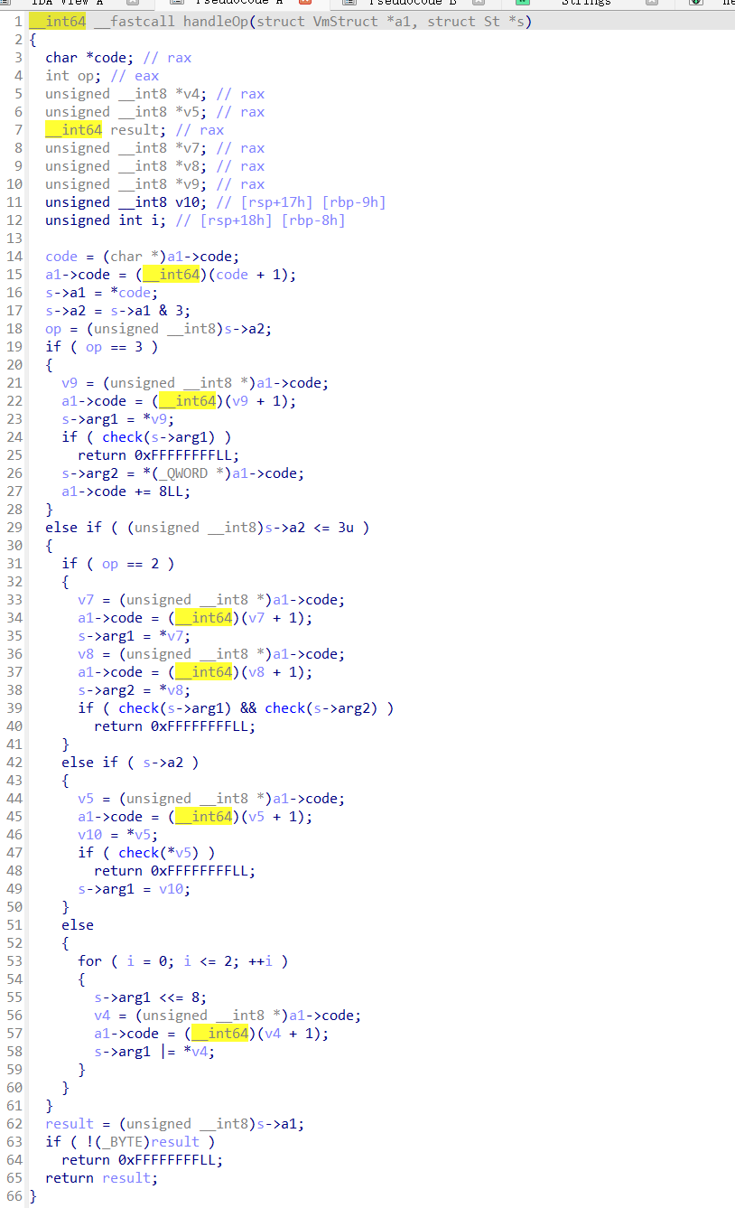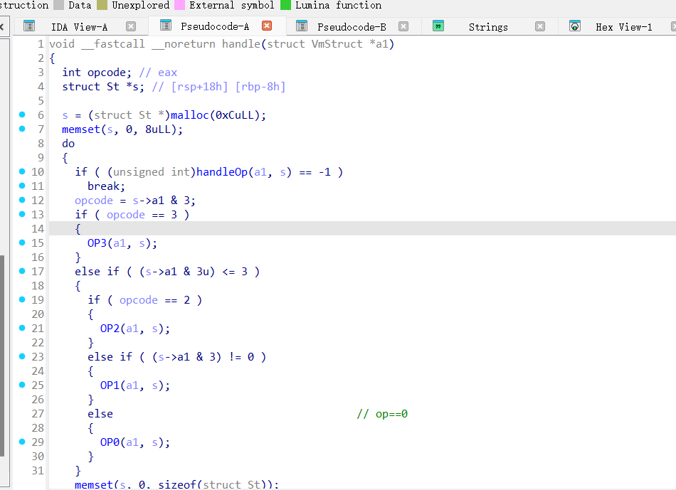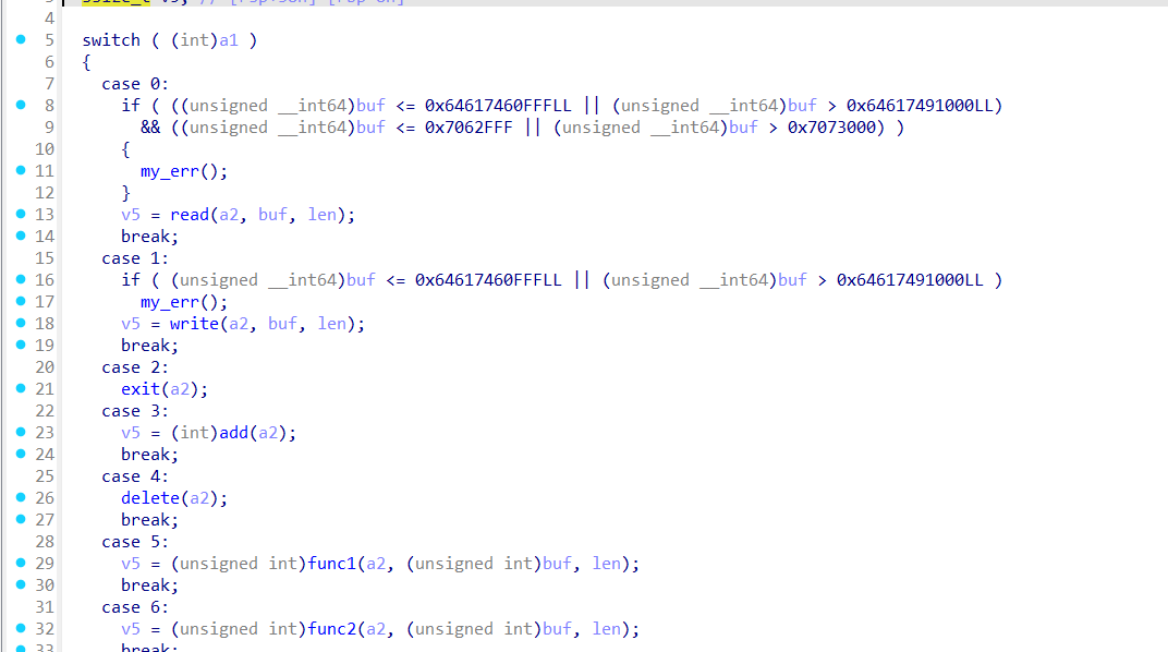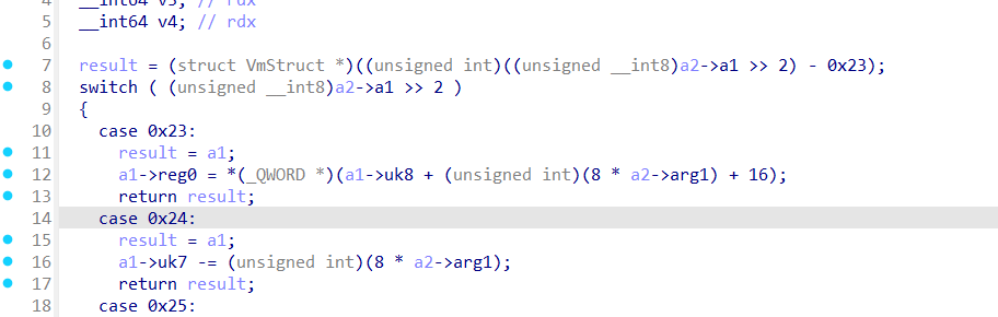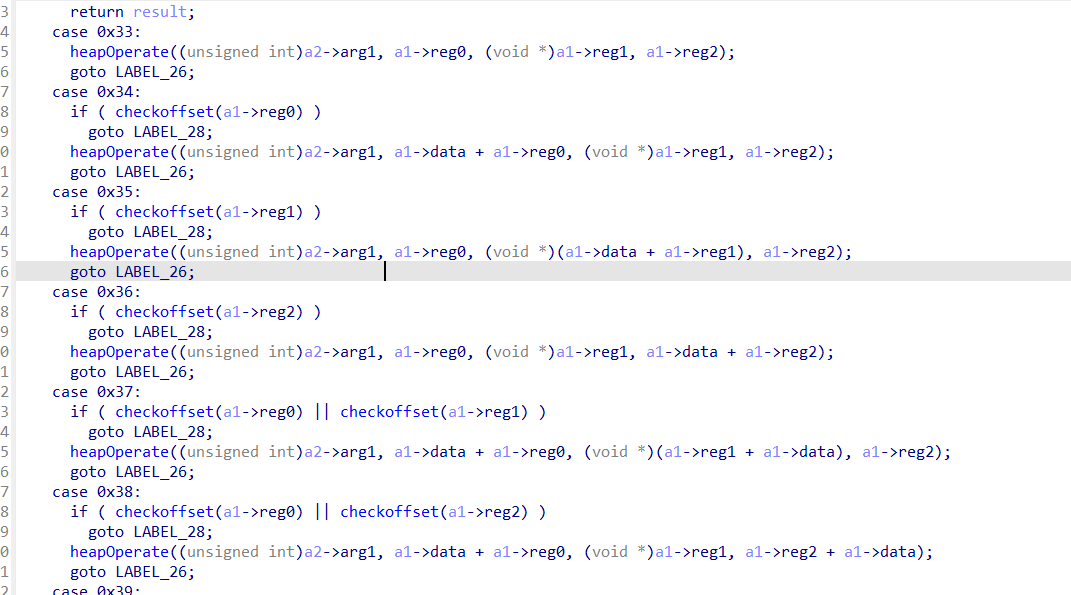 外面的OP0,OP1,OP2,OP3各有各的作用,它这个vm给的非常全,几乎覆盖了我能想到的所有指令。以OP0为例子.这里的switch-case是根据a2->a1 » 2来决定的,其实也就是一个字节的高6位,所以当时过了两个多小时还没有解,出题人给了个四大四小的提示,其实就是对应这个题目的一个自己的高6位和低2位,但当时已经逆向完了