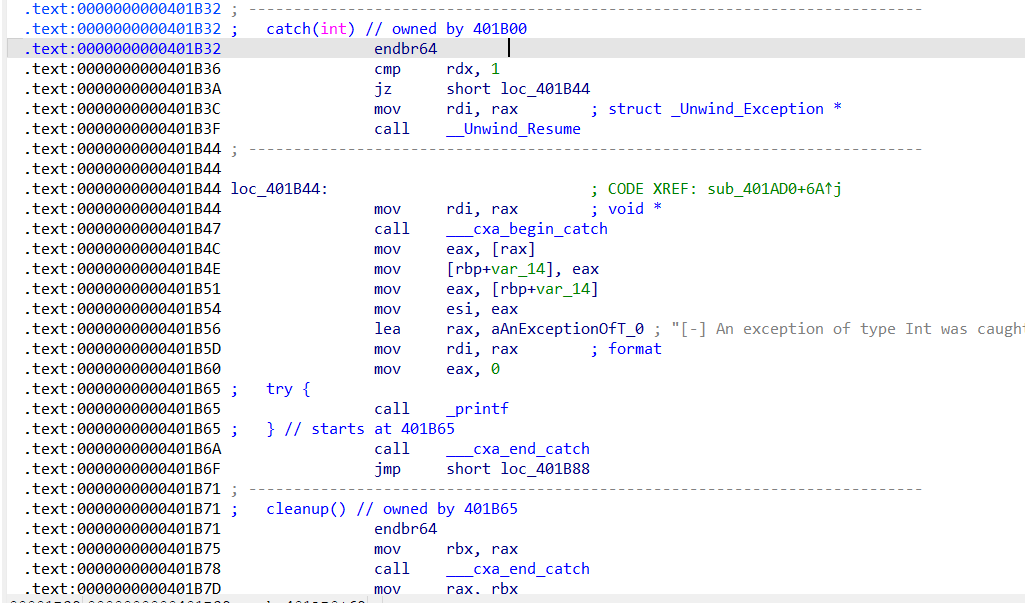 0x401A37:0x4019A1->0x401a64(main中的catch块)->0x401A62->0x4019F2