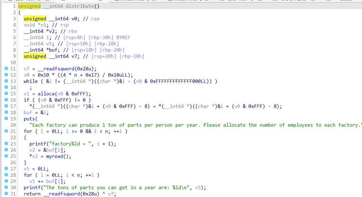 但是注意到一个很奇怪的地方 v0 = 0x10 * ((4 * n + 0x17) / 0x10uLL); 为什么v0不是8*n,64位条件下,栈应该是8字节对齐
