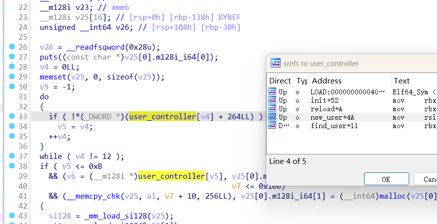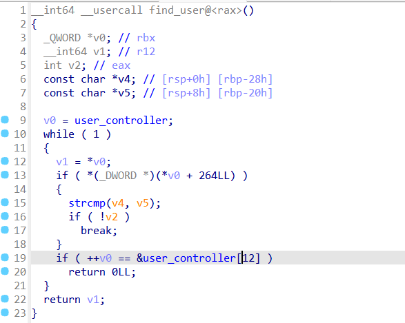 user_controller就和普通菜单堆里面的chunklist比较像,find_user是ShowUser和DeleteUser中都会先调用的函数,其功能就是找到对应的存储块,注意这里的strcmp函数