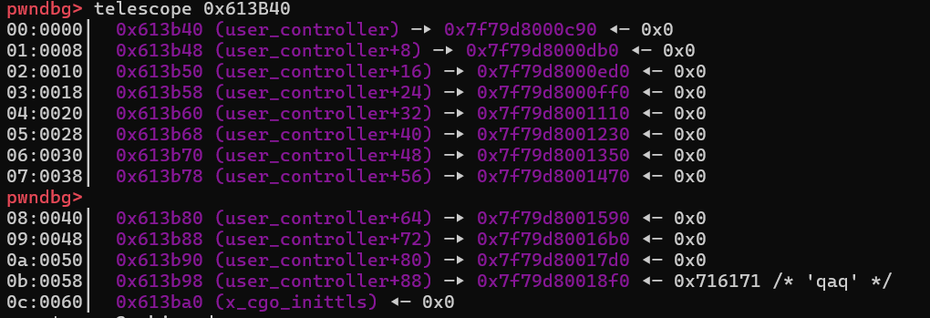 NewUser函数开辟了很多空间,有的在堆块上,有的是mmap出来的,整体比较乱,不是很好具体分析。但是我们可以把他类比成普通菜单堆中的add函数,还是能正常地申请堆块